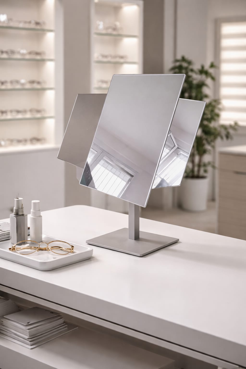 Espejo con base y barra anodizada. Los laterales son fijos.