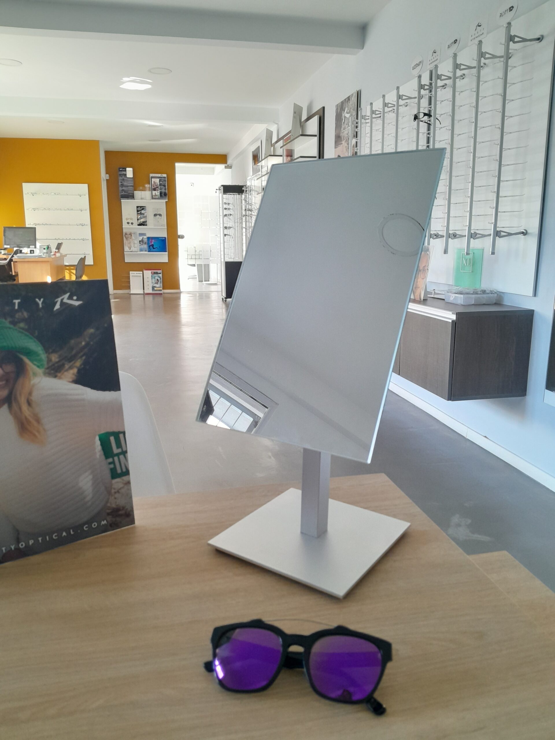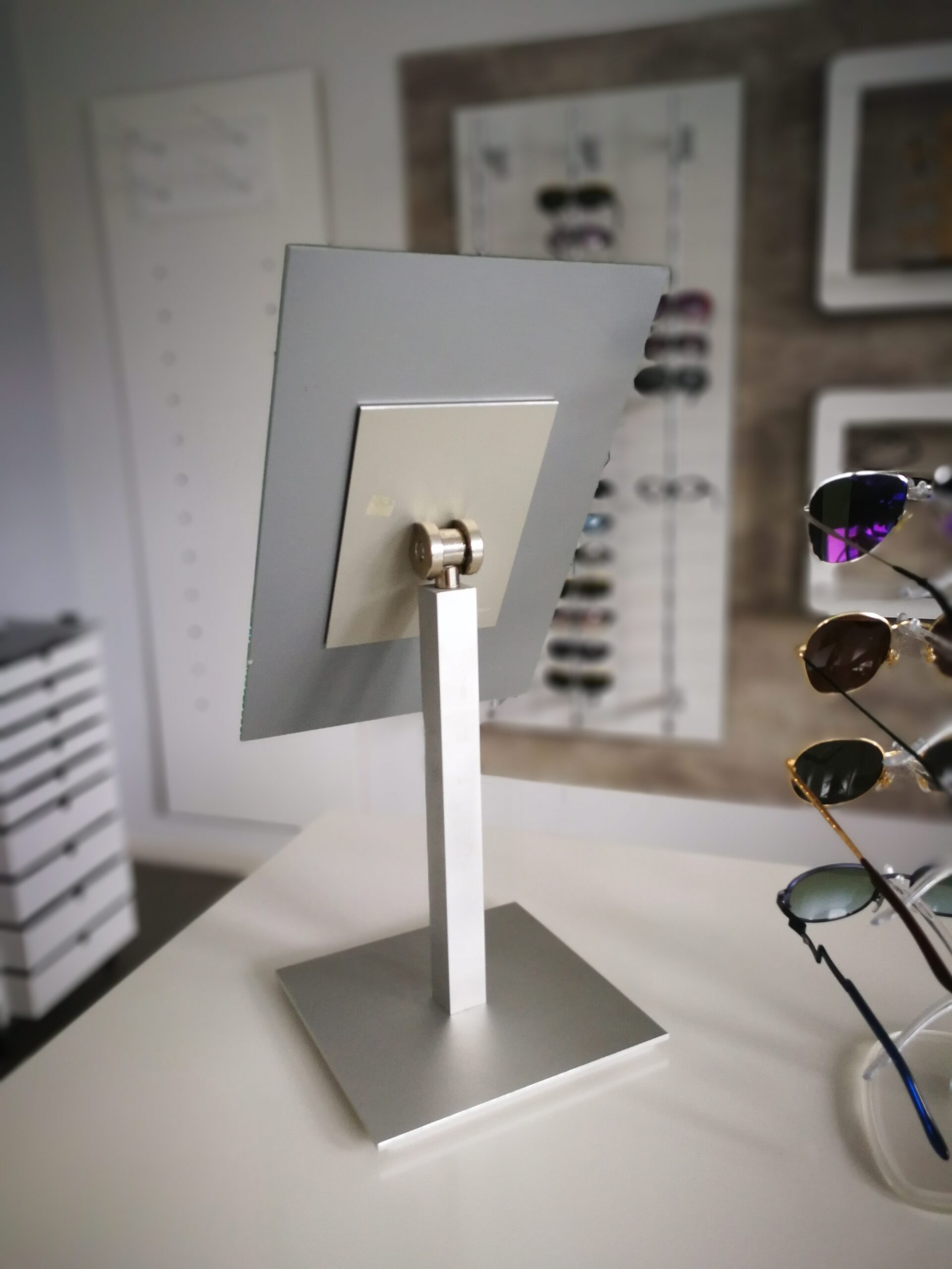 Espejo con base y barra anodizada.