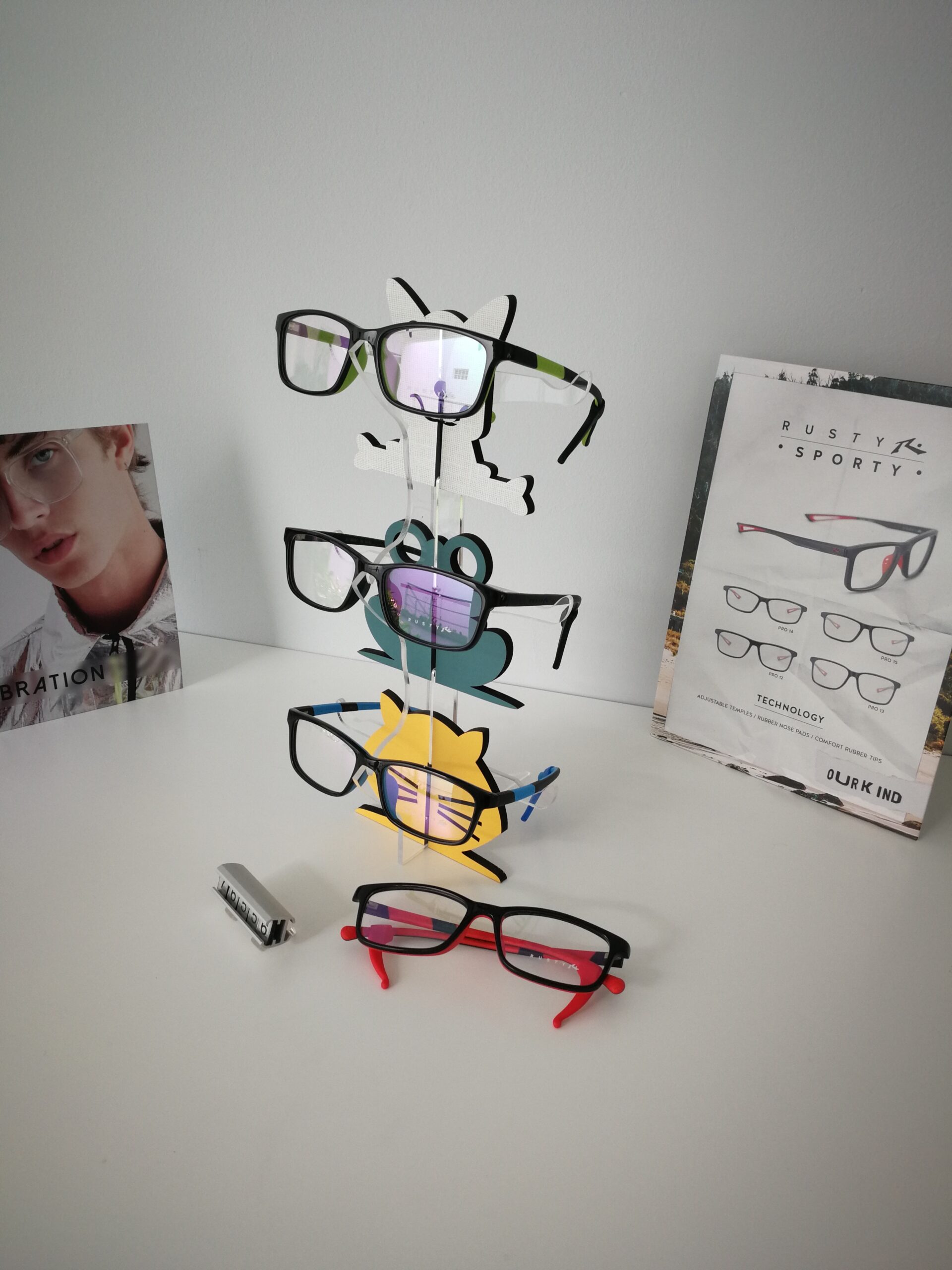 Divertido exhibidor realizado en acrílico cristal y melamina de hermosos y vivos colores.