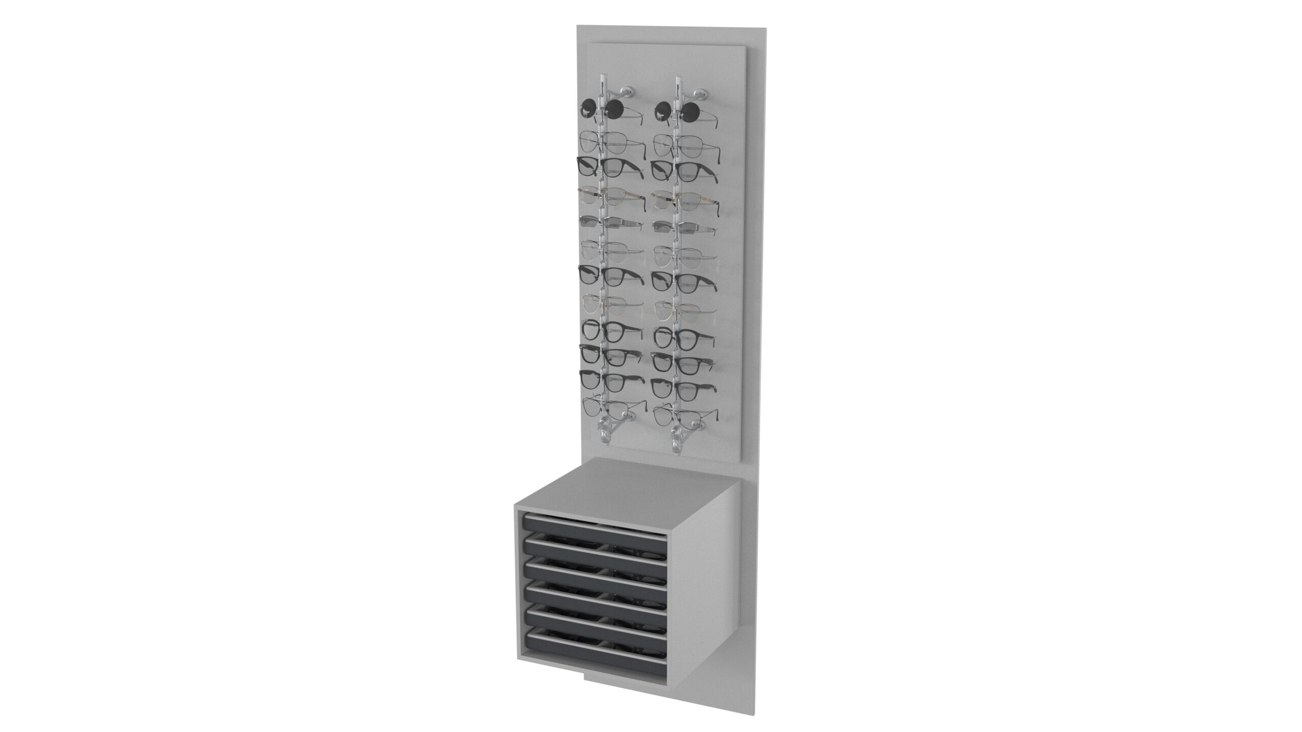 con cajonera en melamina de 18 mm con 6 bandejas de 12 p cada una.